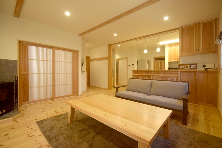 細い讃が美しいオリジナルの建具が映えるリビング。