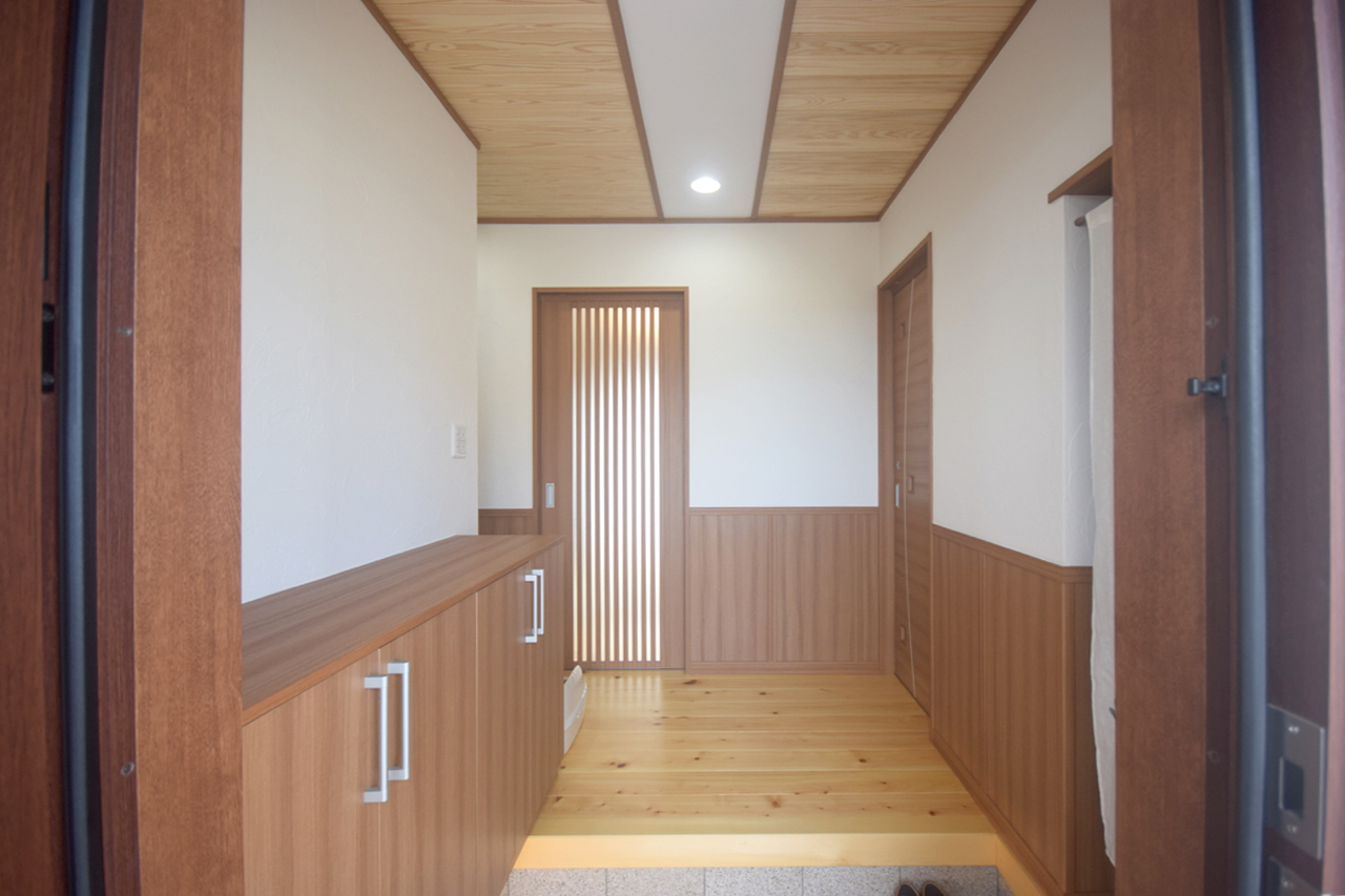 玄関ホール。濃いめの木材、縦の木目のストライプ。