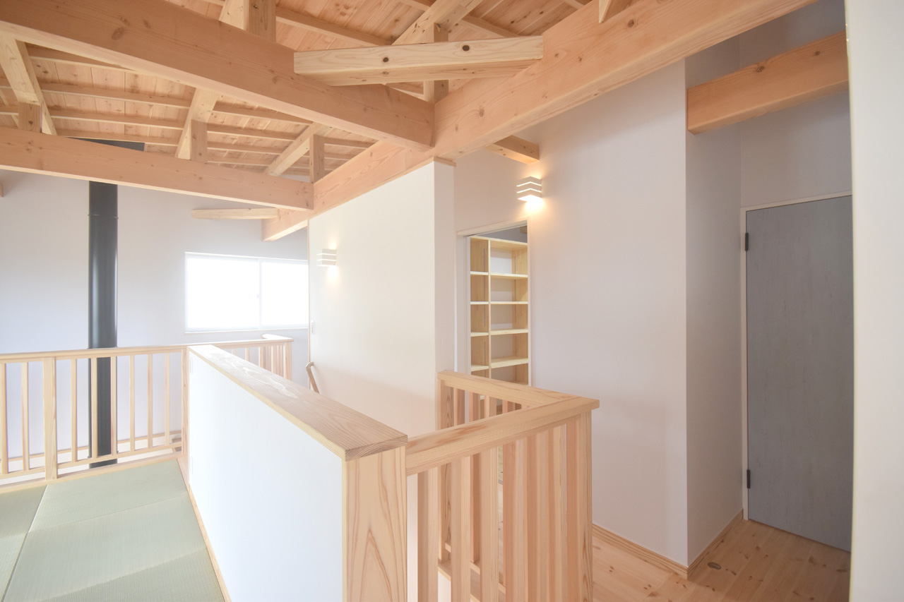 吹き抜けで二階もストーブの熱が広がって暖かに。