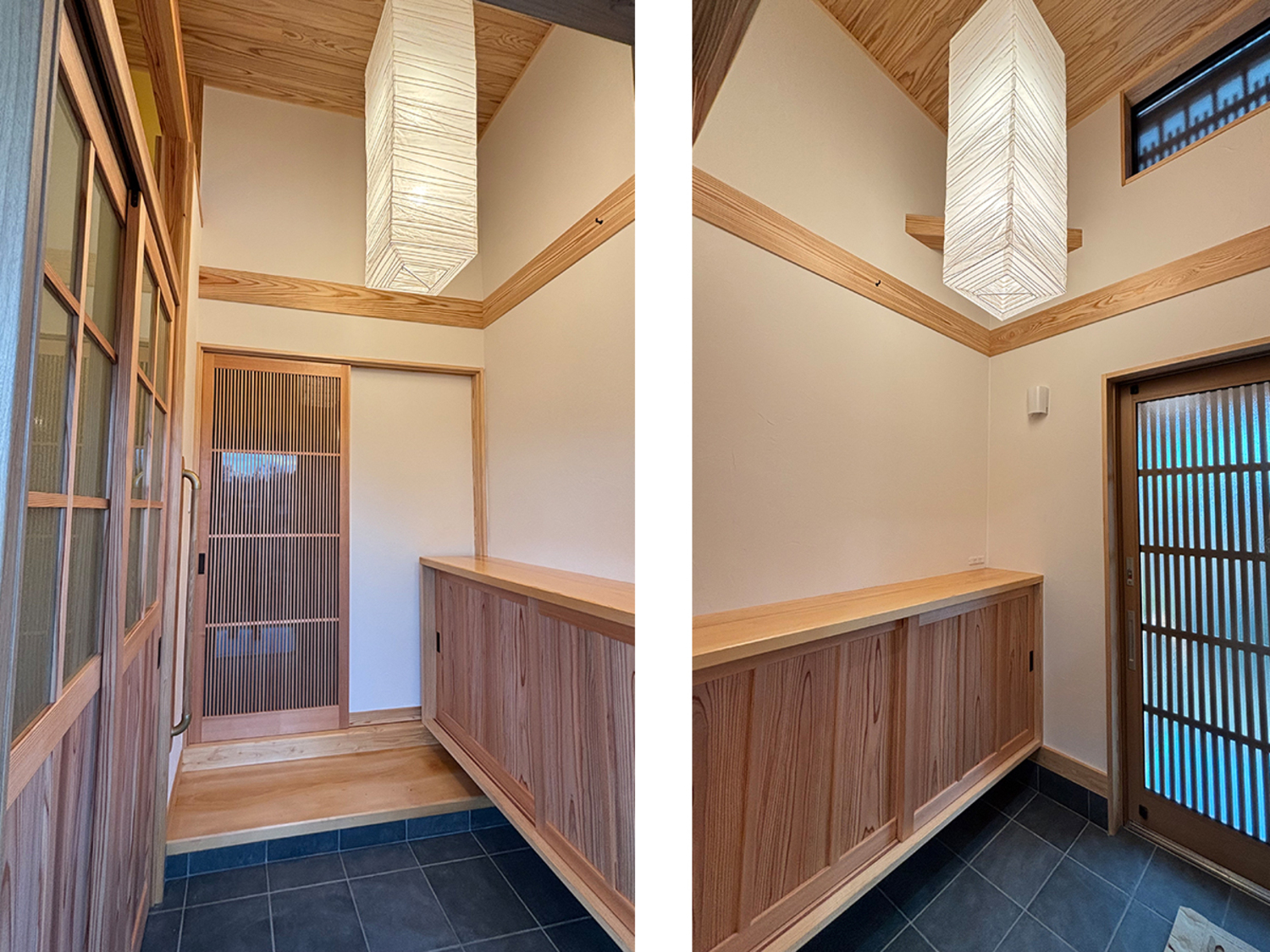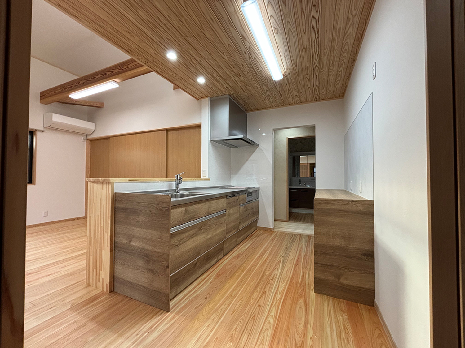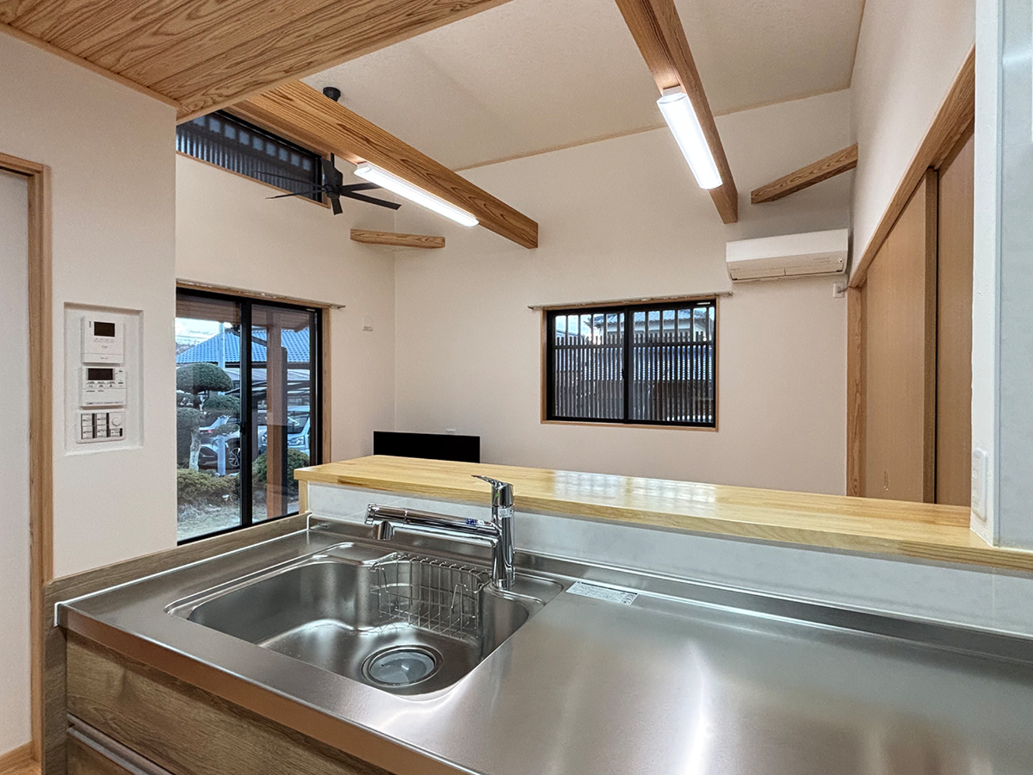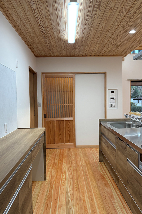 ホーム フォトギャラリー タイプ別 平屋 常陸大宮市 城下町家風の家 常陸大宮市 城下町家風の家 小場城跡の近く立地にふさわしく、城下町の町家風イメージを外観に取り入れた家 タイプ別|平屋 上品な濃いグレーの壁の色と明るい柱の色の取り合わせが美しい外観タイトルにある通り、「町家の趣」を取り入れた佇まいになっています 玄関や窓には格子を取り入れていますが、スタイリッシュなイメージなるようにまとめています画像のみを表示全 11 枚中 1 枚目を表示Next ≫ アプローチから続くタイルで誘われる玄関ホールフルオーダーの建具や下駄箱も繊細なデザインで統一されています 写真の右側のガラス引き戸は土間から直接入ることのできる隣室画像のみを表示全 11 枚中 2 枚目を表示≪ Prev|Next ≫ 土間から入ることのできる隣室は応接間お客さまはここで靴を脱いで上がることができます 住まい手の室内からの動線も、もちろんバッチリ確保されています画像のみを表示全 11 枚中 3 枚目を表示≪ Prev|Next ≫ 玄関ホールからLDKへ 真っ直ぐにキッチンを配置することで買い物の食材なども楽に運び入れることができます画像のみを表示全 11 枚中 4 枚目を表示≪ Prev|Next ≫ 明るく開放感のあるリビングダイニング 梁を見せて天井高を確保しより一層広がるイメージに画像のみを表示全 11 枚中 5 枚目を表示≪ Prev|Next ≫ キッチンはリビングダイニングと対面式に画像のみを表示全 11 枚中 6 枚目を表示≪ Prev|Next ≫ 天井とキッチンの色を統一し、まとまりのある室内を演出 キッチンから直接、洗面や洗濯機などの水回りに行くことができます画像のみを表示全 11 枚中 7 枚目を表示≪ Prev|Next ≫ こちらの化粧板も濃いブラウンに統一されています 画像のみを表示全 11 枚中 8 枚目を表示≪ Prev|Next ≫ 浴室の脇に洗濯機を設置 窓の明かりを遮らないように板を設置して洗剤などちょっとしたものを置けるように一工夫画像のみを表示全 11 枚中 9 枚目を表示≪ Prev|Next ≫ LDK奥の廊下は広くとっており手持ちの家具や収納など置くこともできます画像のみを表示全 11 枚中 10 枚目を表示≪ Prev|Next ≫ 取り回しの良いサイズ感のトイレ すっきりとしたデザインのものを採用しています画像のみを表示全 11 枚中 11 枚目を表示≪ Prev 小場城跡の近く立地にふさわしく、城下町の町家風イメージを外観に取り入れた家 木構造 平屋建て 延べ床面積 93.16㎡(28.18坪) 設 計:小林正一建築設計事務所 一覧へ戻る タイプ別 設計士別 リフォーム&リノベーション パーツ別 すべて 平屋 二階建て 二世帯住宅 小林正一建築設計事務所 建築設計室シドミ アトリエ・マーニ 鴨志田玲子建築設計室 樹・中村昌平設計事務所 その他 すべて 薪ストーブ 建具 キッチン 造作棚